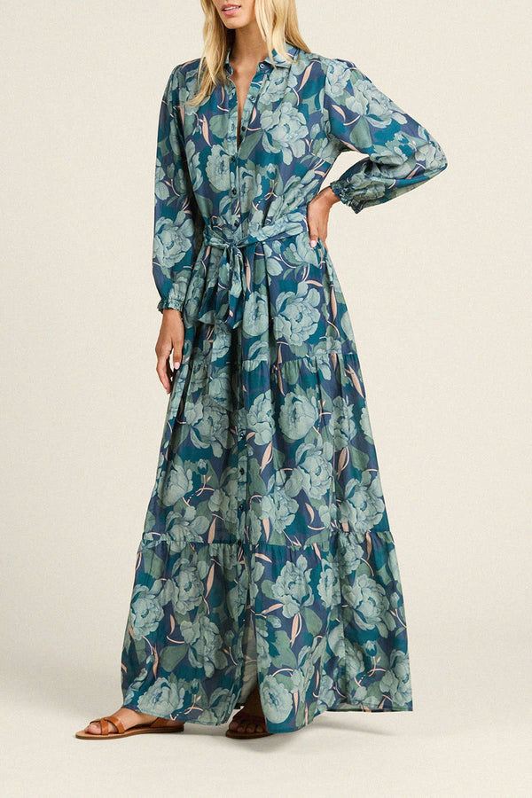 Our Martina dress is long and flowing, reaching the ground. Long pleats from the waist give extra movement to the tiered skirt. Completed with antique white buttons and matching self-fabric sash.