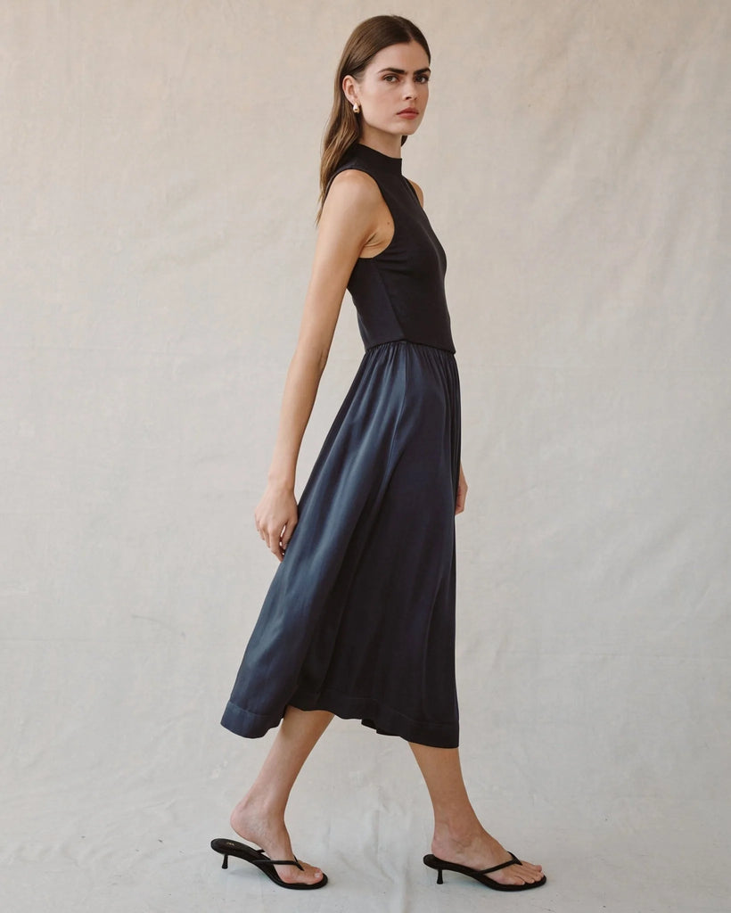 Streamlined and versatile, the Sleeveless Mock Neck Mixed Dress is a modern staple designed for effortless layering