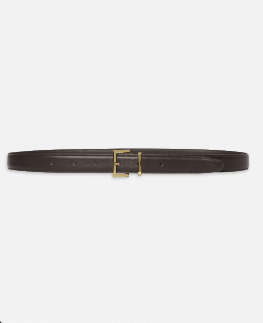 Crafted from dark brown leather with a squared gold buckle, this belt adds a refined finish to denim, trousers, or crisp shirting. It's the foundational piece with clean edges and a soft, smooth feel.