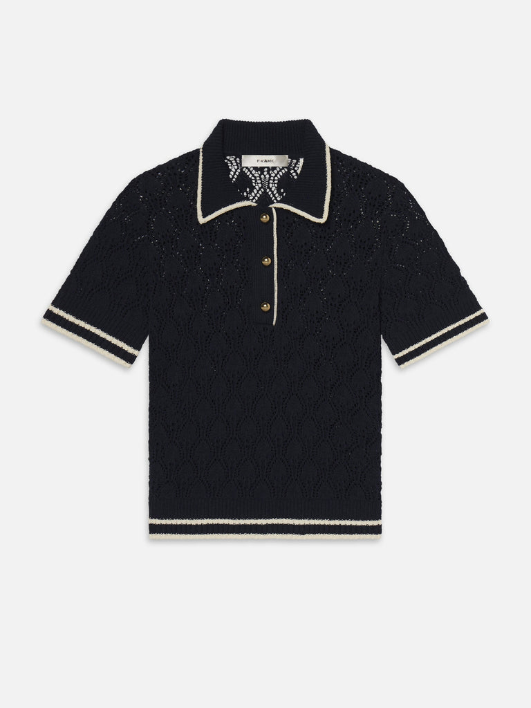The Rookie Polo is knit with a loose, airy stitch and finished with gold buttons and contrast white trim. A soft take on a sport classic—smart, slouchy, and ready for summer days.