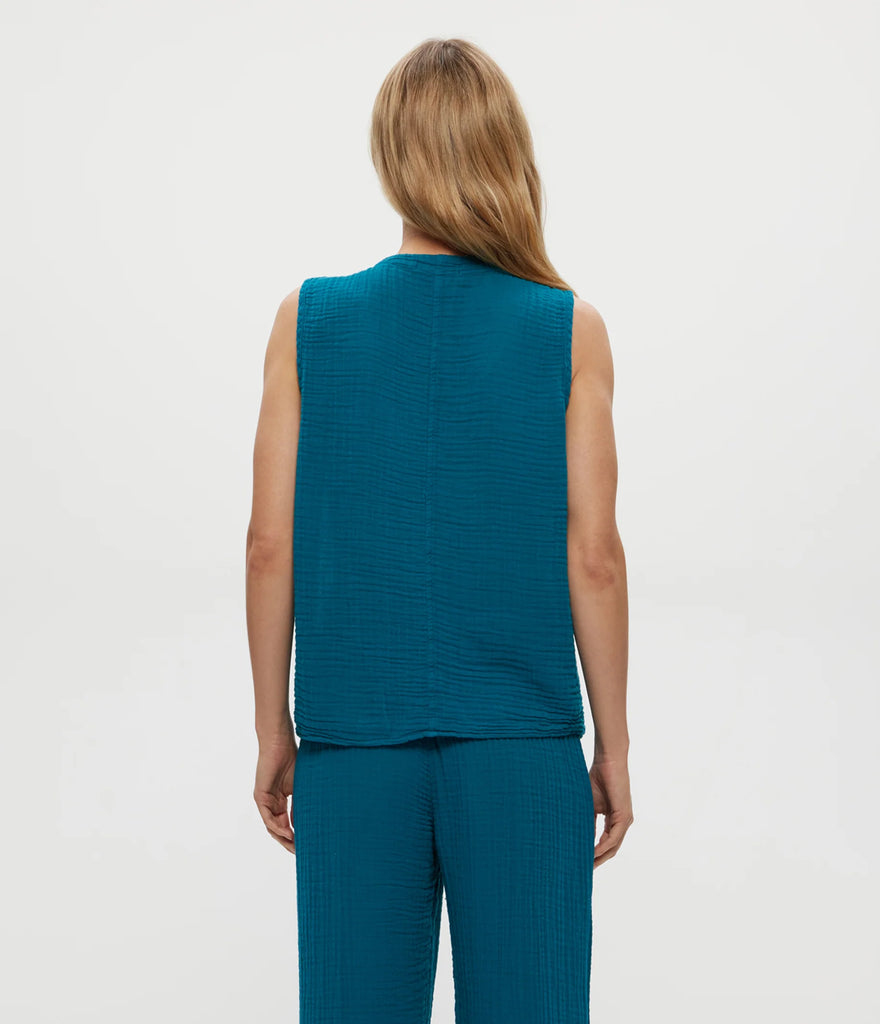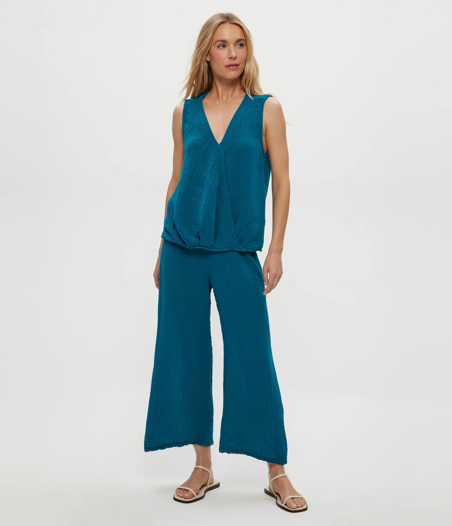 This breezy style features a surplice neckline and a subtle bubble hem. A must-have sleeveless tank, this top is lightweight and a perfect match to your favorite gauze pant