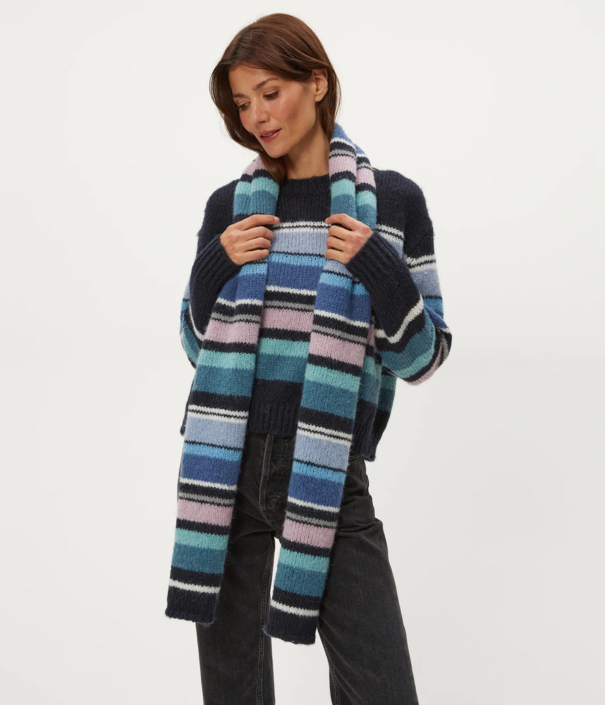 Get wrapped up in the softness of our souffle knit striped scarf. A cold-weather must have, this cozy, oversized scarf goes with everything and feels fabulous.