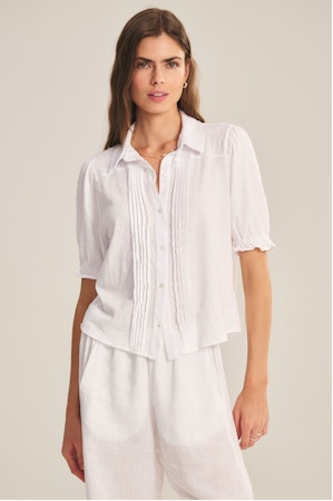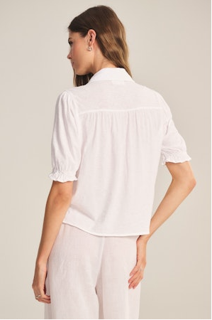 Crafted from soft cotton slub, this tee elevates a classic silhouette with refined style. It features a full button front and classic collar for timeless structure, with pleated detailing down the front adding subtle texture. The back is softly ruched, and slightly puffed sleeves with ruffle elastic cuffs bring a feminine, elevated touch.