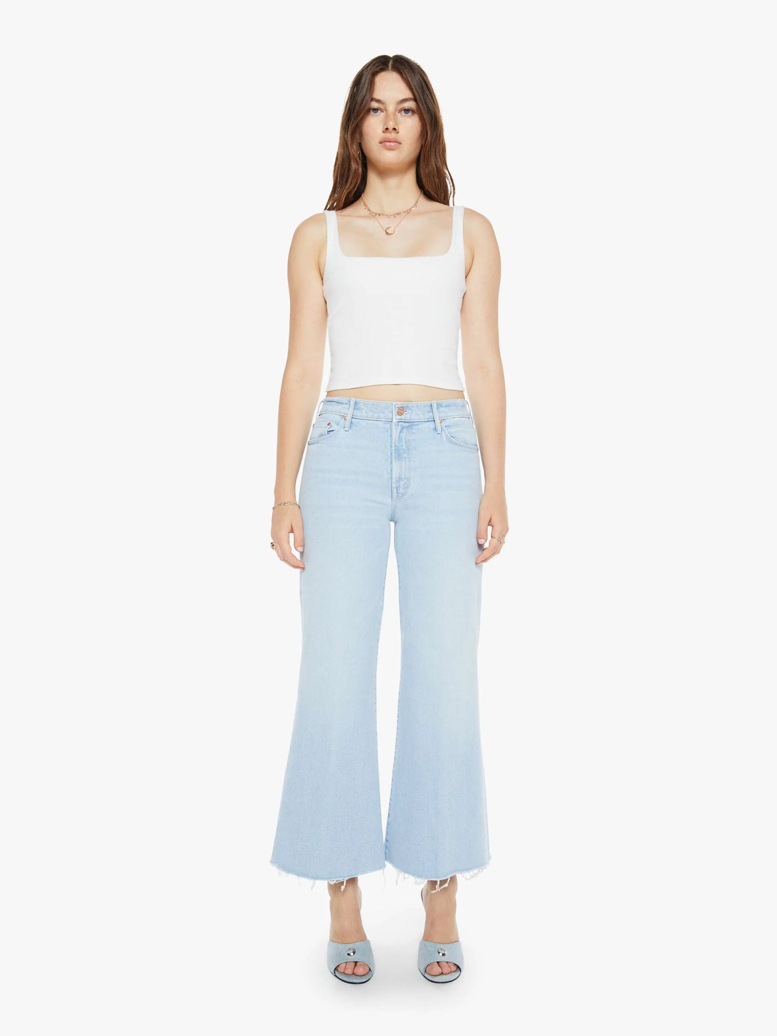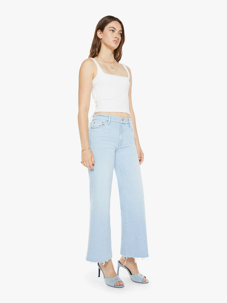 High-rise jeans with a flared wide leg and an ankle-length inseam with a frayed hem. Cut from denim with a touch of stretch, Cowabunga is a light blue with subtle fading throughout.